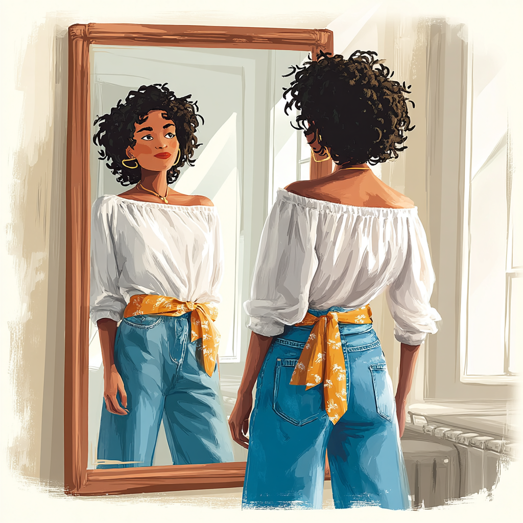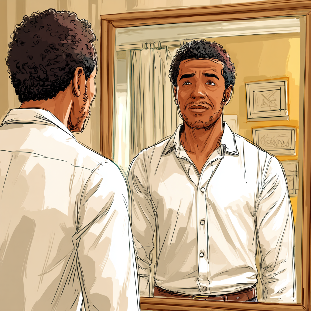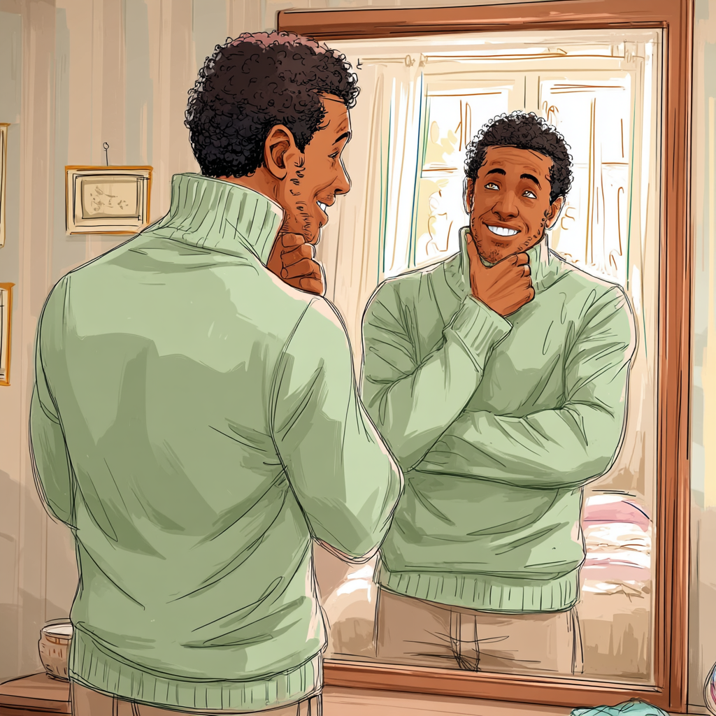 På den andre siden av byen står Jonas foran speilet på soverommet. Han skal på date med ei jente. Jenta heter Thea. «Hva skal jeg ha på meg?» tenker han. Han tar på seg en hvit skjorte. Den er litt formell. Så prøver han en rød t-skjorte. «Nei, for enkel,» tenker Jonas. Til slutt finner han en svart skjorte med mørke jeans. «Perfekt,» sier han og smiler til speilet.