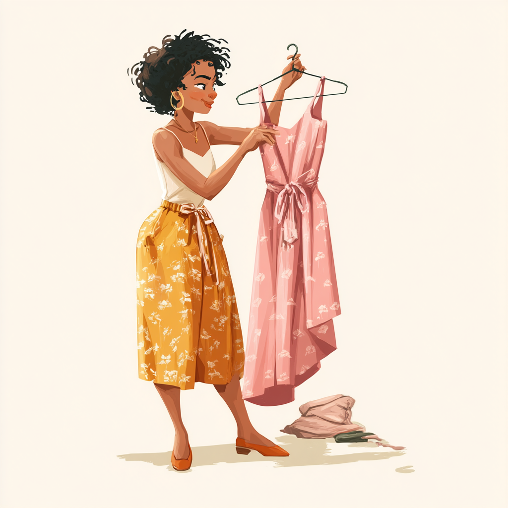 Thea står foran speilet. Hun er spent. Hun skal på date. «Hva skal jeg ha på meg?» tenker Thea. Hun ser på en rosa kjole. Kjolen er søt. Kanskje den er bra? Hun prøver også en hvit bluse med blå bukser. «Hmm,» tenker hun, «kanskje litt for vanlig.» Til slutt finner hun en lilla kjole. «Ja, denne liker jeg!» sier hun til seg selv.